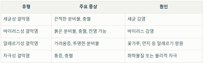 - 바이러스성: 아데노바이러스나 단순포진바이러스에 의해 발생하며 전염성이 강합니다.