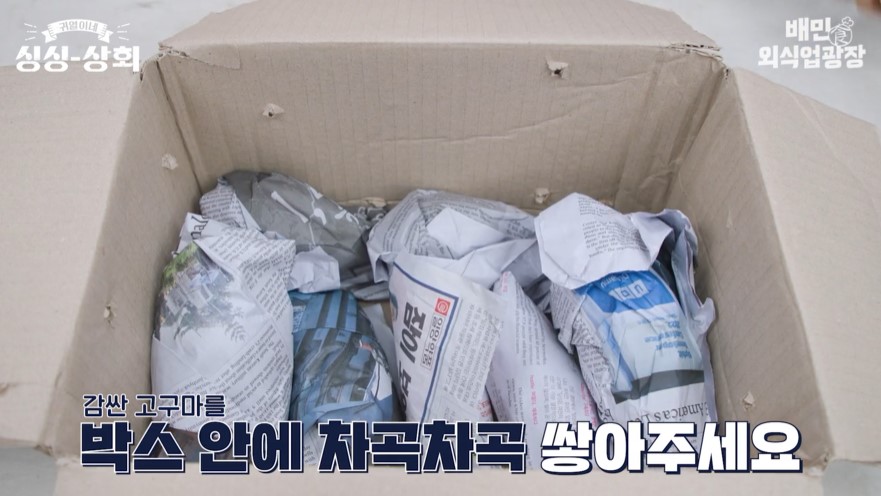 - 신문지를 깔고 그 위에 고구마를 올려놓으세요. 습기를 잡아줘요.