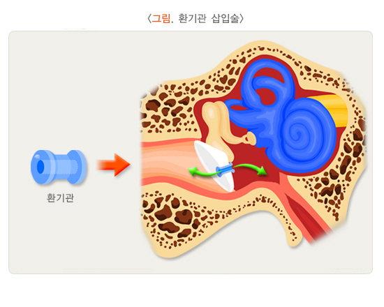 - 삼출성 중이염의 경우 환기관 삽입술로 액체 제거