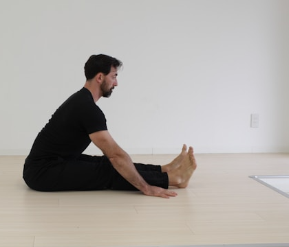 - 손을 다리 사이로 넣어 허벅지 뒤를 잡고 무릎을 가슴 쪽으로 당깁니다.