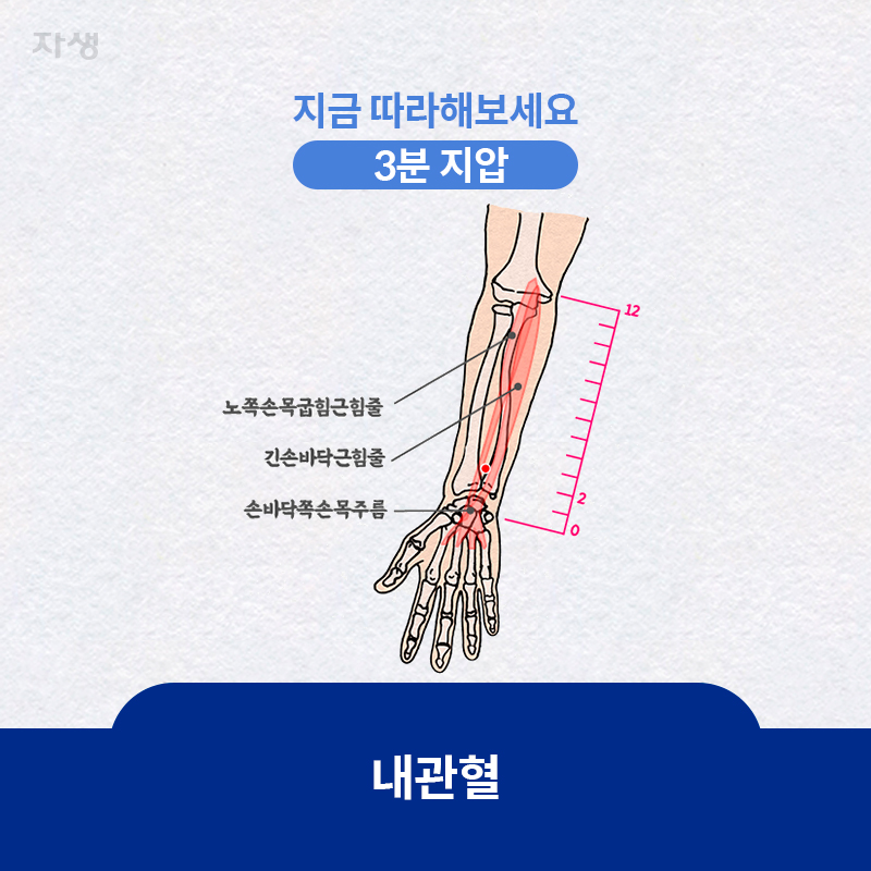 - 내관혈: 손목 안쪽에서 손가락 세 마디 아래 위치를 지압하면 구역감과 울렁거림을 완화할 수 있습니다.